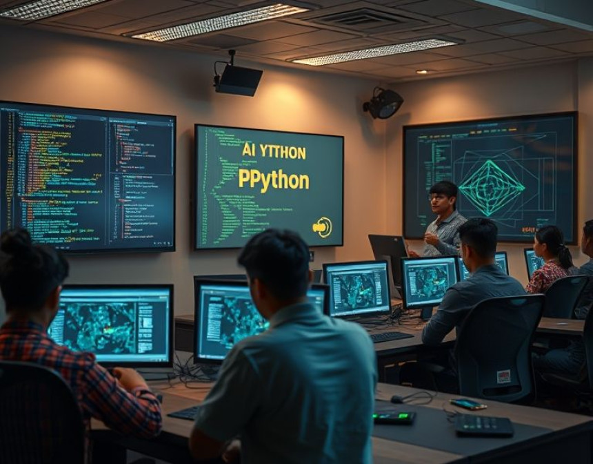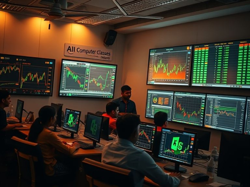 Cinematic, hyperrealistic image of students in an advanced classroom in Indore learning st...
